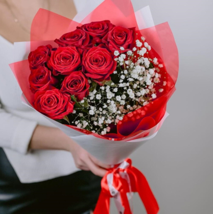 Букет из красных роз и гипсофилы | Купить в Волгограде