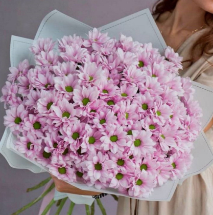 Светло-сиреневые ромашковые хризантемы с оформлением